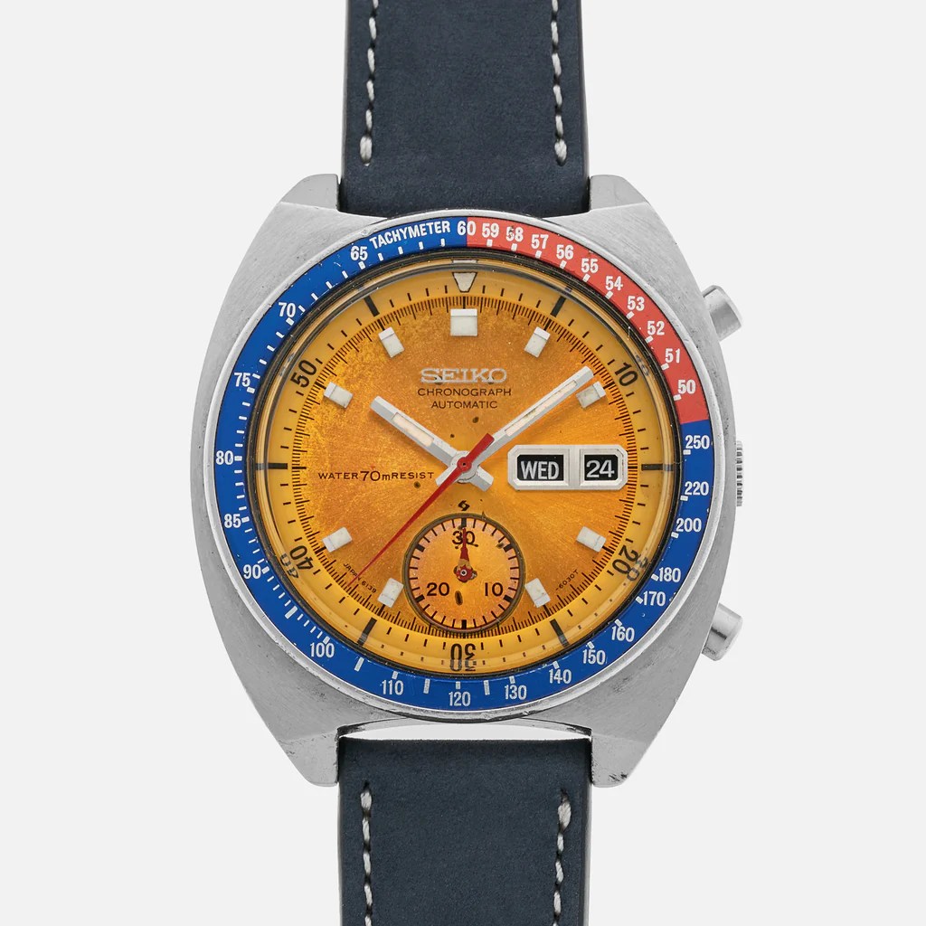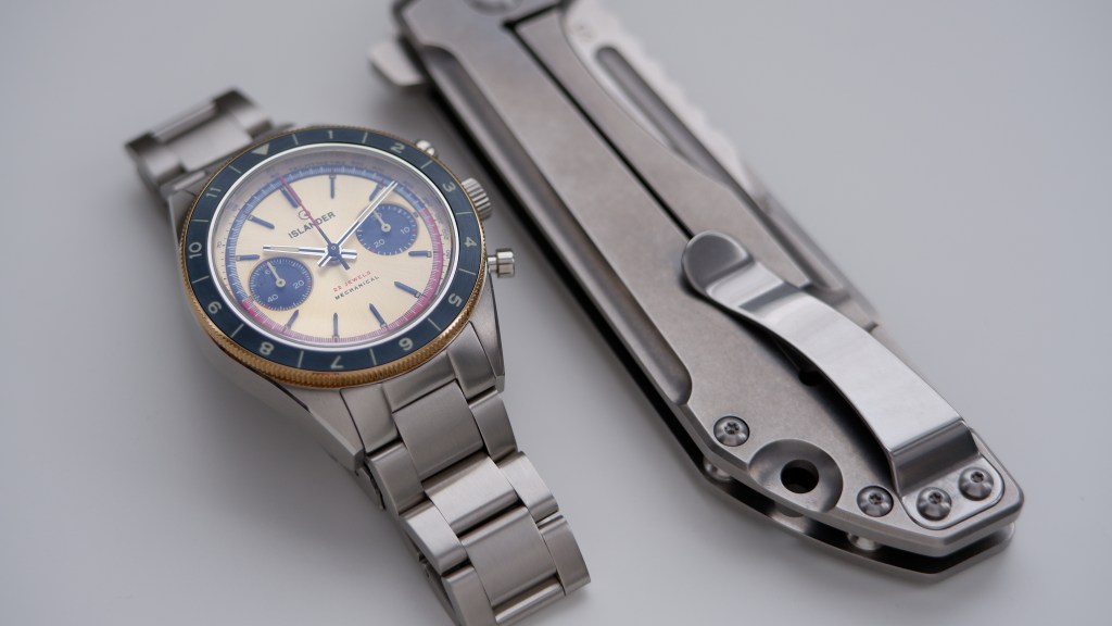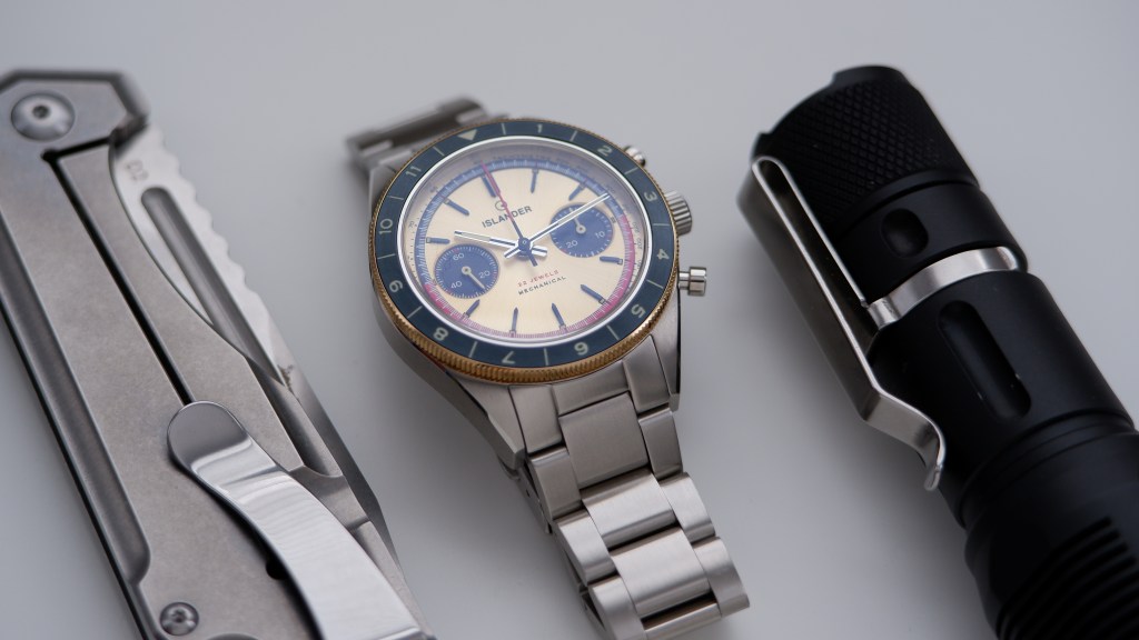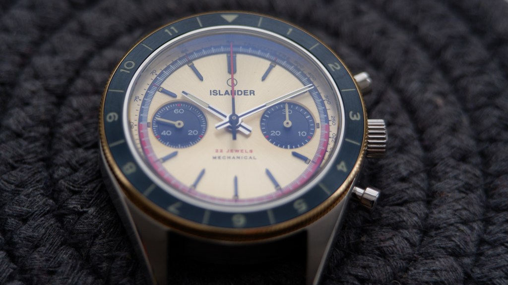 So far, the 40mm watch comes in 4 different colorways. There are black and blue dialed versions with white subdials as well as the classic panda variant, a white dial with black subdials. The final colorway is the one I have in for review, a beautiful gold dialed model with deep blue subdials. If you remember from my review of the ISL-02, there is sometimes a connection between Islander Watches and Seiko’s past offerings. If you look a bit closer at the chapter ring, you will see that the red and blue , along with the gold dial, is a subtle call back to the “Seiko Pogue” ref. 6139-6002 – one of Seiko’s iconic watches from the 1970s. Another feature of this colorway is the gold-toned bezel. I think two-tone is a bit of an acquired taste, but I am a fan of this addition. Even more so, I am glad that they did not extend the gold-tone onto the bracelet.