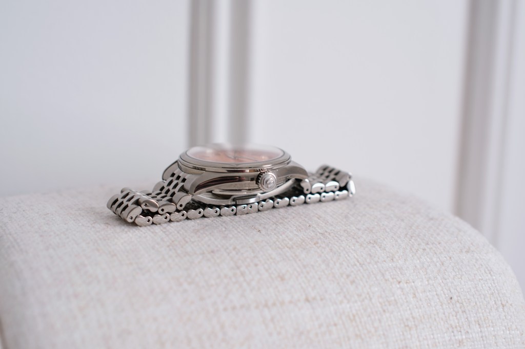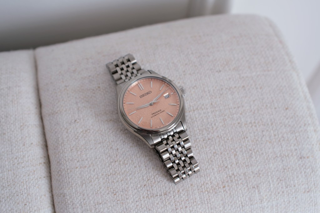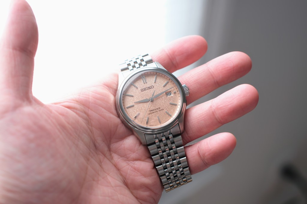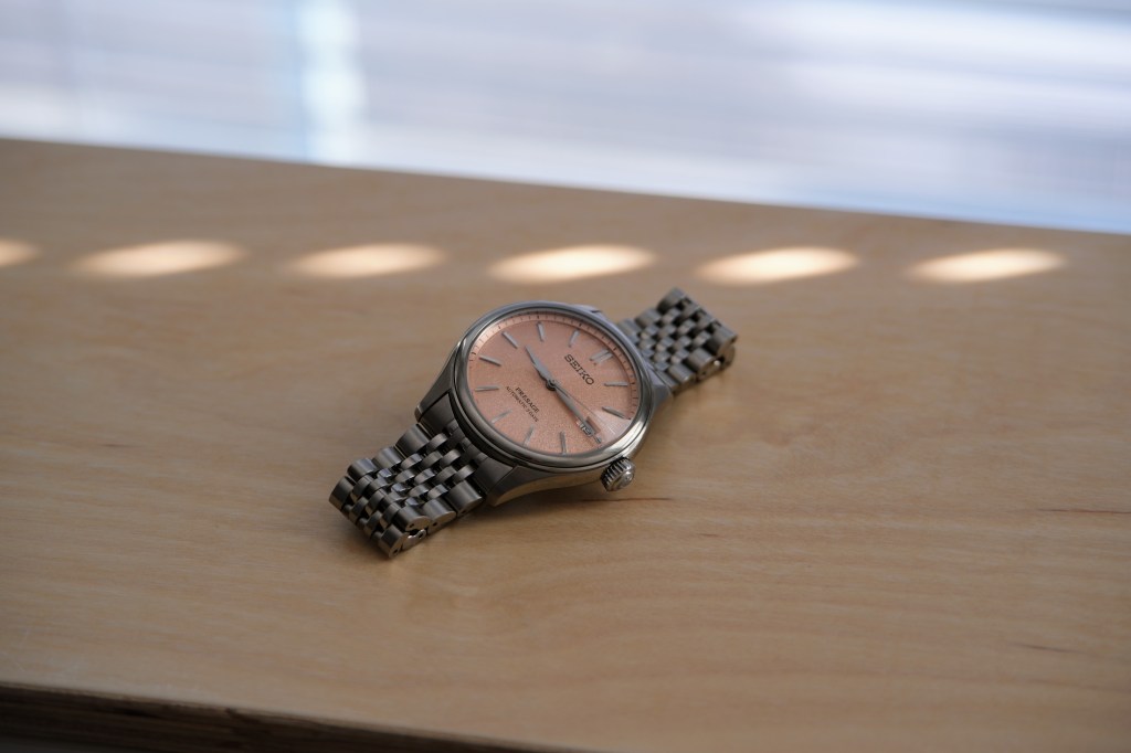 What do you look for in a good watch? An interesting dial? A nice bracelet? Good form factor and fit? These are all things that the Seiko Presage SPB467 offers. Generally speaking, the first thing you notice on any watch is the dial, and what a fantastic dial this watch has. Salmon colored dials have always been popular on watches, but, after looking into the marketing materials, Seiko describes this watch as having a “araigaki” colored dial. Araigaki, according to Seiko, is a washed and bleached persimmon color. Fair enough, it’s still a gorgeous color. The dial furniture is pretty standard fare for Seiko at this price, with beautifully polished hour markers and hands. The smooth markers really compliment the grainy dial. This grainy, sandy texture is meant to invoke the luster of a silken fabric.