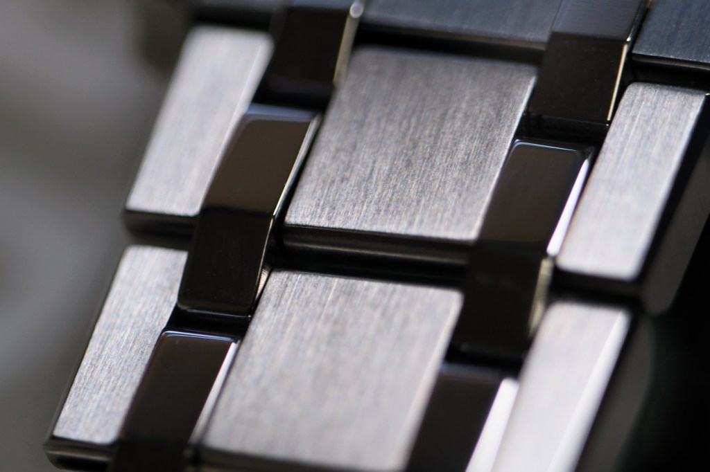 The other unique aspect of the watch is the construction of its case and bracelet. Minase builds its watches using many smaller individual parts that, when combined, produce a distinctive multi-faceted design. The best description of this process I have seen is the traditional Japanese wooden puzzle. Like these puzzles, the many parts of a Minase watch work in unison to construct a singular item with design aspects that would not be possible in a traditional watch. Most traditional watch cases consist of three separate pieces: the bezel, the mid case, and the caseback. The Divido’s case is constructed out of seven distinct parts: the upper, mid, and lower cases and two pairs of lugs. A great example of the unique construction techniques would be the lug/bezel/crystal assembly. On a traditional watch, the lugs are part of the case and a bezel is pressed onto the case over the crystal. On the Divido, the lugs are still part of the case, but the tops of the lugs are attached in a way that looks like the lugs are clamping down on the bezel and crystal. The lugs actually protrude a bit over the crystal.